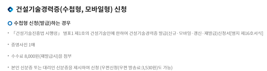 7. 수첩형 경력증 신청 화면에서는 증명사진, 신청서(별지 16호 서식), 수수료 납부 안내가 표시되며, 사용자는 사진 규격과 수수료 정보를 확인한 뒤 본인 신분증이나 대리인 신분증을 제시하여 신청할 수 있습니다.