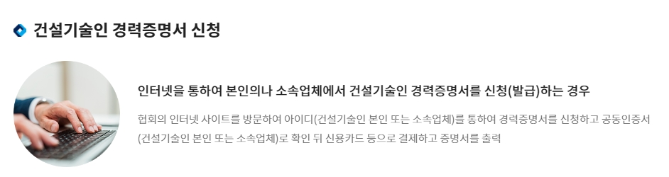 3. 인터넷을 통해 본인 또는 소속업체 아이디로 로그인한 후, 공동인증서 확인 과정을 거쳐 경력증명서 발급 요청 화면이 표시되며, 사용자는 신용카드나 기타 결제 수단을 선택하여 결제를 진행할 수 있습니다.
