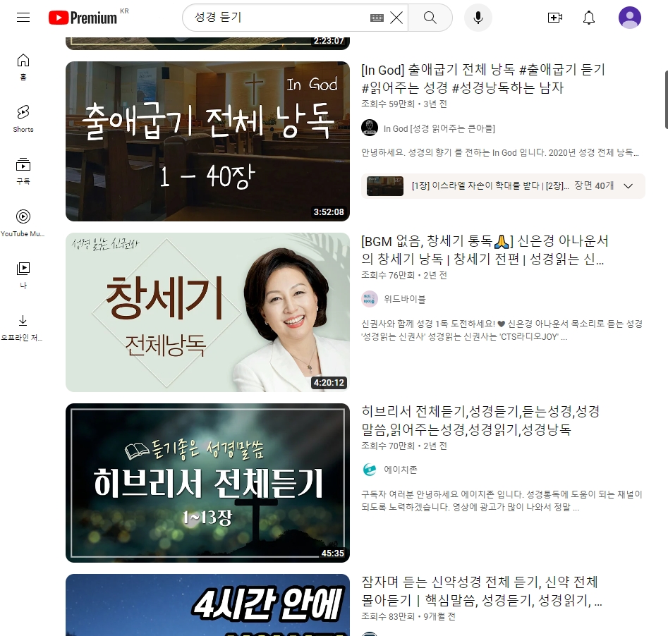 먼저 컴퓨터나 핸드폰에서 유튜브 홈페이지에 들어가거나 어플을 실행해주세요. 요즘에는 남녀노소 누구나 유튜브를 즐겨보기 때문에 아마 익숙하게 사용하실 수 있을 거예요. 따로 무언가를 설치하거나 가입할 필요 없이 바로 이용할 수 있어서 정말 간편하답니다. 성경 말씀을 듣기 위해 복잡한 과정을 거치지 않아도 된다는 점이 가장 큰 장점이라고 할 수 있어요.