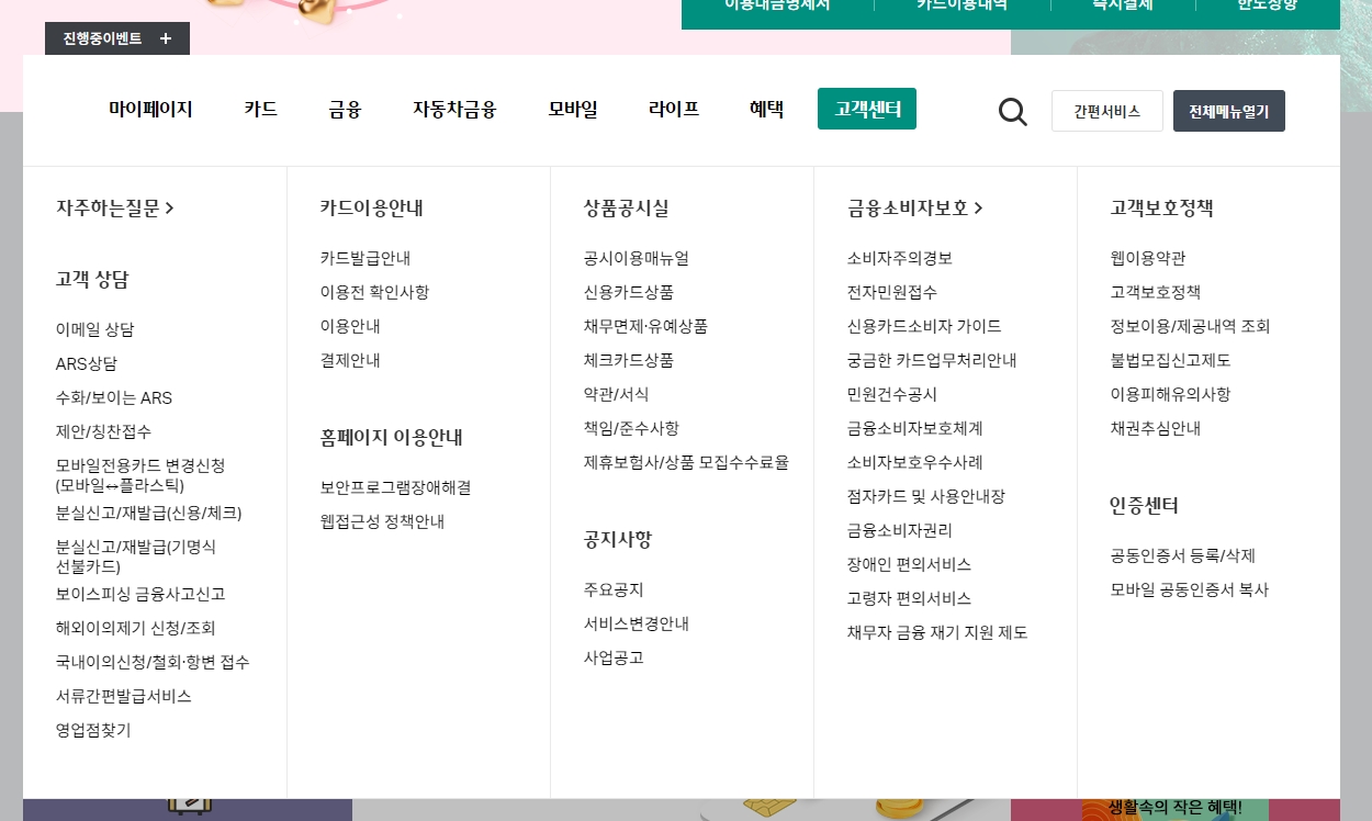 그 아래쪽으로는 마이페이지, 카드, 금융, 자동차금융, 모바일, 라이프, 혜택, 고객센터 같은 여러 메뉴들이 쭉 있어서 필요한 정보를 찾기 쉽게 되어 있답니다. 맨 아래에는 추천 카드 정보랑 다른 금융 관련 메뉴들도 바로 갈 수 있게 잘 정리되어 있어서 처음 방문해도 어렵지 않게 이용할 수 있을 거예요.