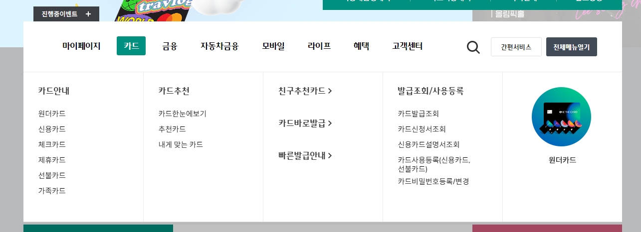 상단 메뉴에 있는 카드 메뉴에 들어가면 정말 다양한 카드들에 대한 정보를 안내해주고 있어요. 원더카드, 신용카드, 체크카드, 다른 회사랑 같이 만든 제휴카드, 미리 돈을 충전해서 쓰는 선불카드, 그리고 가족카드까지 종류가 정말 많습니다. 특히 좋은 점은 카드 추천 기능이 있어서 어떤 카드가 나한테 제일 잘 맞을지 쉽게 찾아볼 수 있다는 점이에요.