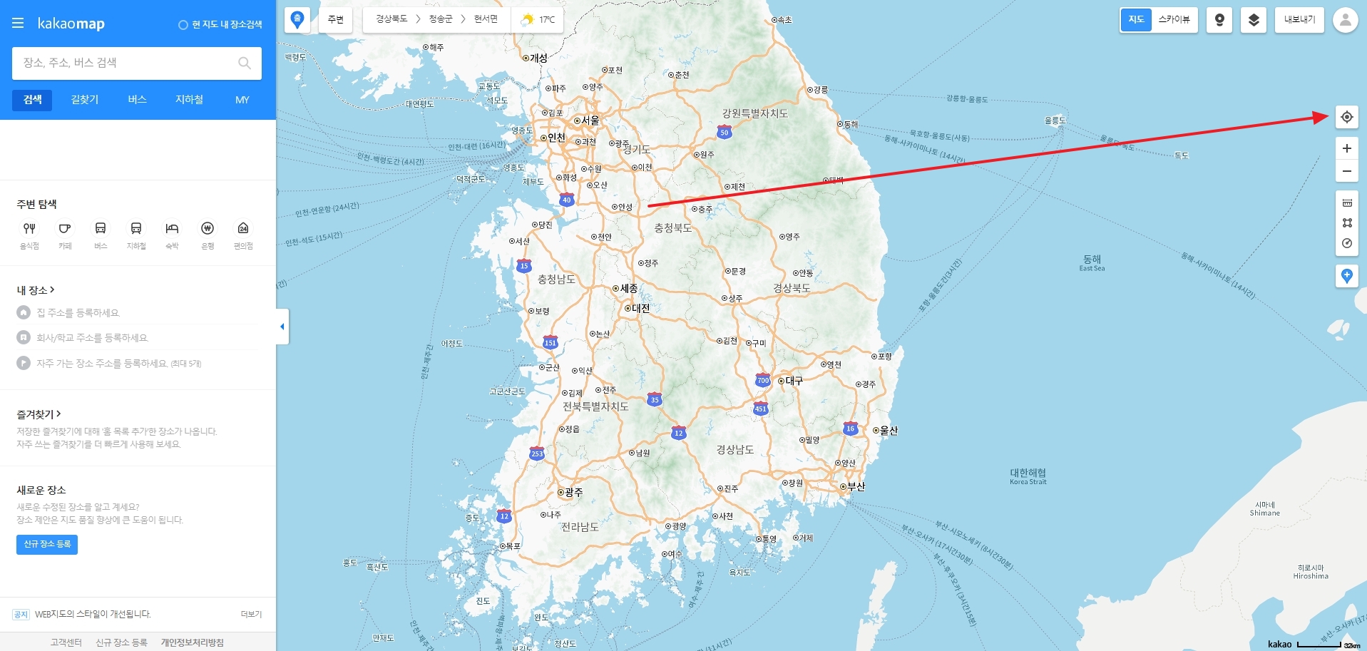 카카오맵을 켜고 나면 화면에서 내 위치를 찾는 건 정말 쉬워요. 보통 화면 오른쪽을 잘 보면 동그라미 안에 과녁이나 나침반 바늘처럼 생긴 아이콘이 하나 보일 거에요.