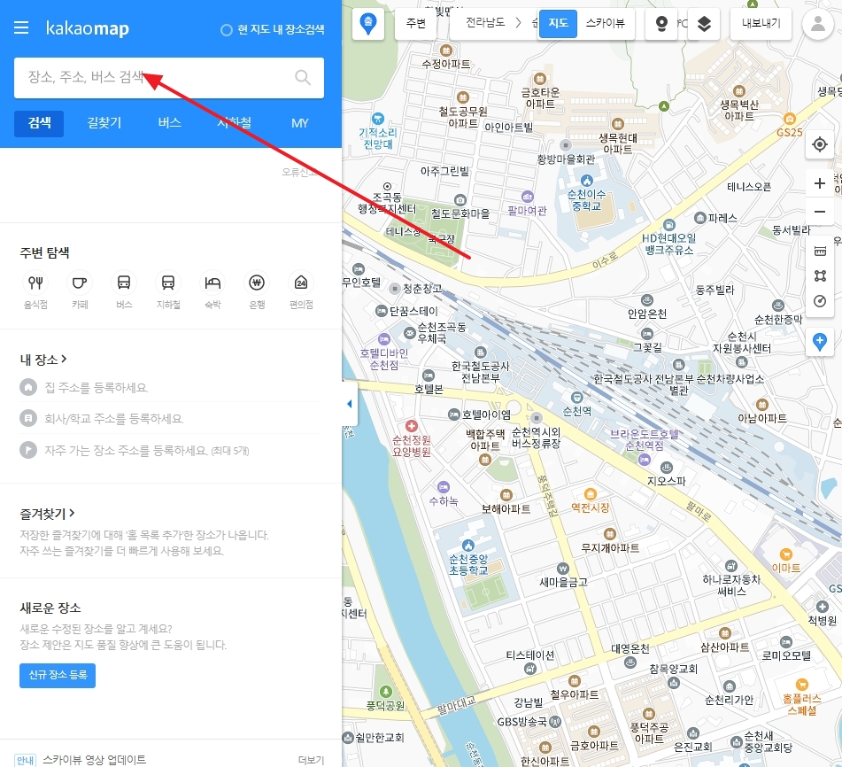 홈페이지나 앱을 켜면 화면 왼쪽 위에 아주 커다랗게 검색할 수 있는 창이 보일 거예요. 여기가 바로 여러분이 찾고 싶은 장소나 주소를 입력하는 곳입니다. 예를 들어서 '경복궁'이라거나 '부산역 근처 맛집' 같은 식으로 궁금한 장소의 이름을 여기에다 적고 검색 버튼을 누르면 지도가 바로 그 위치를 보여주니까 정말 간편하게 정보를 얻을 수 있습니다.
