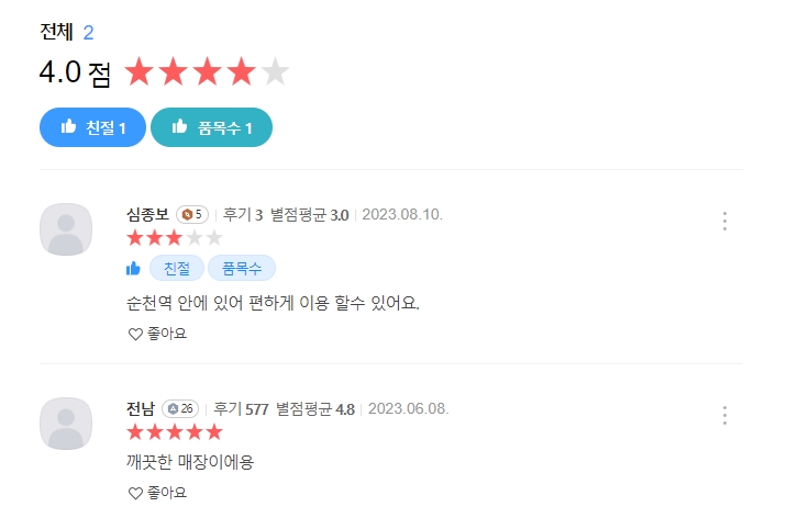 상세 정보 페이지를 아래로 좀 더 내려보면, 이 장소를 먼저 다녀간 사람들이 남긴 리뷰를 볼 수 있는 공간도 있습니다. 솔직히 편의점 같은 곳에 리뷰가 많이 달리지는 않겠지만, 식당이나 카페 같은 곳을 찾을 때는 이 리뷰가 아주 큰 도움이 되죠. 다른 사람들은 이 장소를 어떻게 생각하는지 미리 엿볼 수 있어서 신기하기도 하고 재미있기도 합니다.