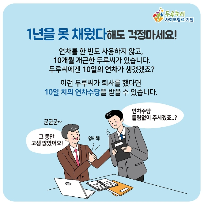 예를 들어 10개월 동안 개근하고 연차를 하나도 쓰지 않고 퇴사한다면, 그동안 쌓인 10일 치 연차에 대해서는 당연히 연차수당으로 받을 수 있습니다. 일한 만큼의 권리는 퇴사 여부와 상관없이 보장받아야 하니까요.