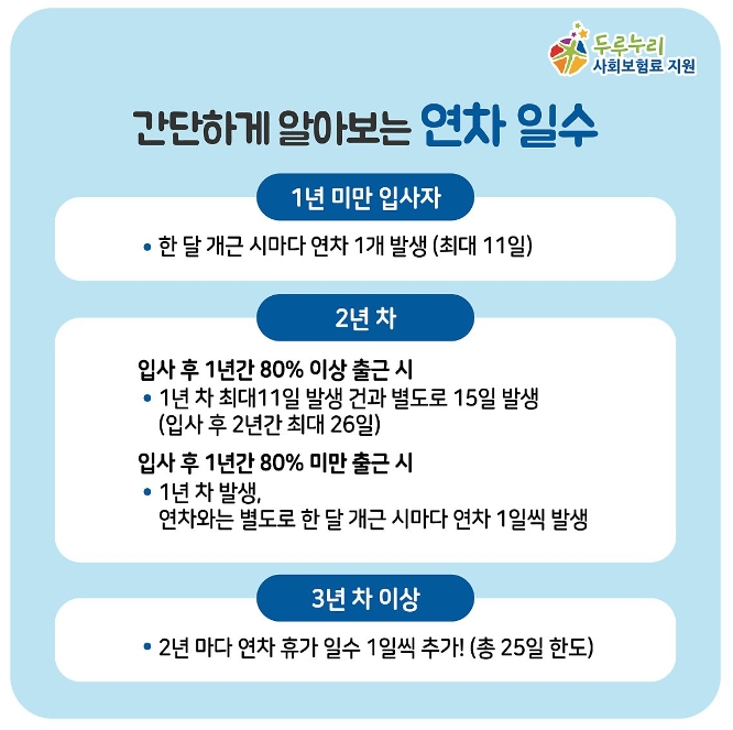 3년차 이상부터는 2년에 1일씩 연차가 추가로 늘어나고, 이렇게 늘어난 휴가는 최대 25일까지 받을 수 있답니다.