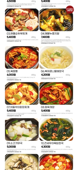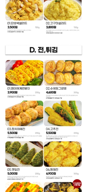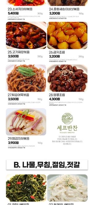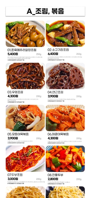 가게 상세페이지로 들어가면 나물, 무침, 볶음, 조림, 국, 찌개, 전 등 정말 상상 이상으로 많은 반찬들이 종류별로 정리되어 있는 것을 볼 수 있습니다. 마치 거대한 반찬 백과사전을 보는 것 같은 기분이죠.