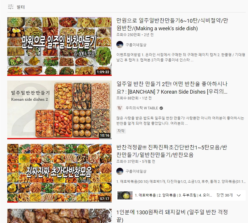 유튜브 검색창에 '일주일 반찬'이라고 검색해 보세요. 이 검색어는 많은 요리 유튜버들이 일주일치 반찬을 한 번에 만드는 콘텐츠를 많이 올리기 때문에 아주 효과적입니다. 물론 '반찬 만들기', '초간단 반찬' 또는 아예 '반찬 종류 100가지'라고 검색해도 비슷한 내용의 유익한 영상들을 많이 찾아볼 수 있으니 다양하게 시도해 보는 것을 추천합니다.