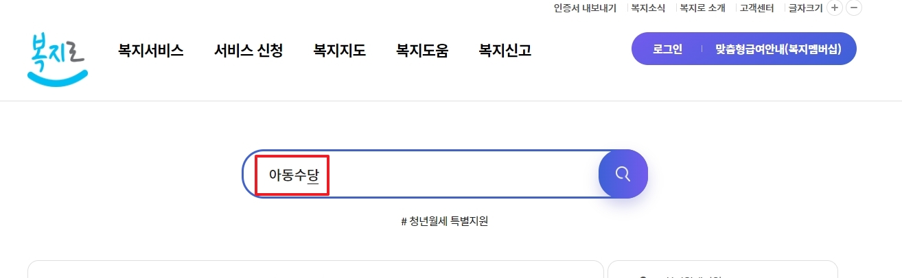 복지로 홈페이지에 들어오셨다면, 메인 화면 중앙에 아주 잘 보이는 검색창이 있을 겁니다. 이 검색창에 우리가 알고 싶은 '아동수당'이라고 입력한 뒤 검색을 실행합니다.