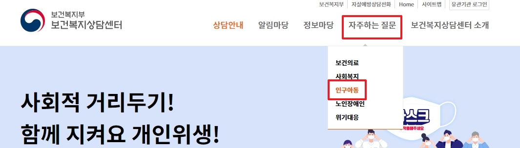 상담센터 페이지로 이동하면 여러 가지 메뉴가 보일 겁니다. 화면 위쪽을 보시면 '자주하는 질문'이라는 항목이 있고, 그 아래로 몇 가지 세부 분류가 나타납니다. 여기서 '인구아동' 카테고리를 선택해서 클릭해 주세요.