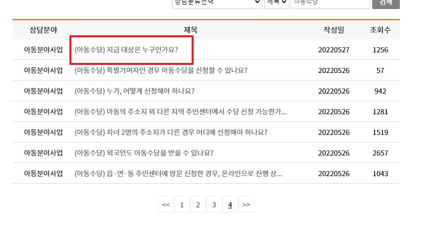 검색 결과가 여러 페이지에 걸쳐 나올 수 있습니다. 페이지를 넘기면서 '아동수당 지급 대상은 누구인가요?'와 같이 가장 궁금했던 내용과 일치하는 질문을 찾아서 클릭하면 됩니다.