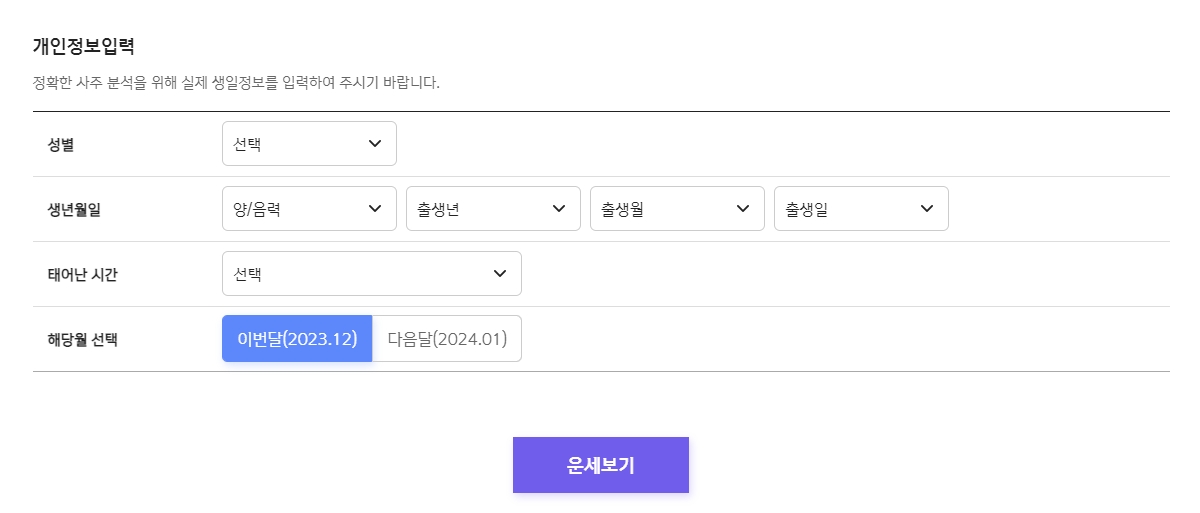 이제 자신의 정보를 입력할 차례입니다. 성별을 먼저 선택하고, 그 다음으로 자신의 생년월일을 양력이나 음력에 맞게 정확하게 입력해주세요. 사주팔자는 태어난 시간까지 알아야 훨씬 더 정확한 결과를 얻을 수 있습니다. 그래서 태어난 시간을 아는 분은 꼭 정확한 시간을 넣어주시는 것이 좋습니다. 만약 잘 모르겠다면 '모름'을 선택해도 괜찮습니다. 그리고 이번 달 운세를 볼지, 아니면 다음 달 운세를 미리 볼지도 선택할 수 있어서 편리합니다.