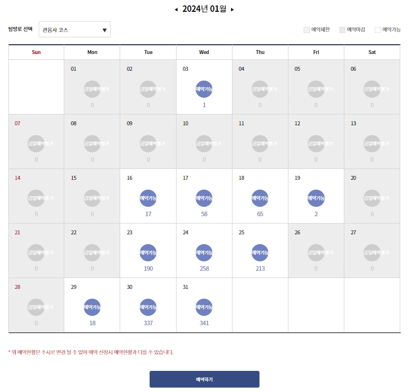 예약 페이지에 들어가면 가장 먼저 달력 형태로 된 예약 현황을 마주하게 됩니다. 여기서 원하는 날짜를 선택하여 예약 가능 인원이 남아있는지 확인할 수 있습니다. 주말이나 공휴일은 경쟁이 매우 치열하여 몇 주 전부터 마감되는 경우가 많습니다.