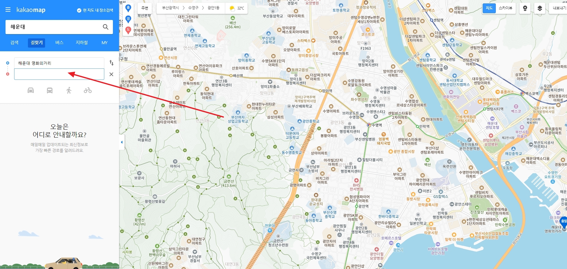 {"filename":"다음_빠른_길_찾기_5.jpg","alt":"출발지와 도착지를 순서대로 설정하는 과정"} 출발지 설정 후, 이제 도착지를 검색하여 입력할 차례입니다. 왼쪽 이미지와 같이 '광안리'를 검색하여 원하는 도착지를 찾습니다. 검색 결과 목록에서 정확한 장소를 선택하면 오른쪽 이미지처럼 지도 위에 도착지 핀이 표시됩니다.