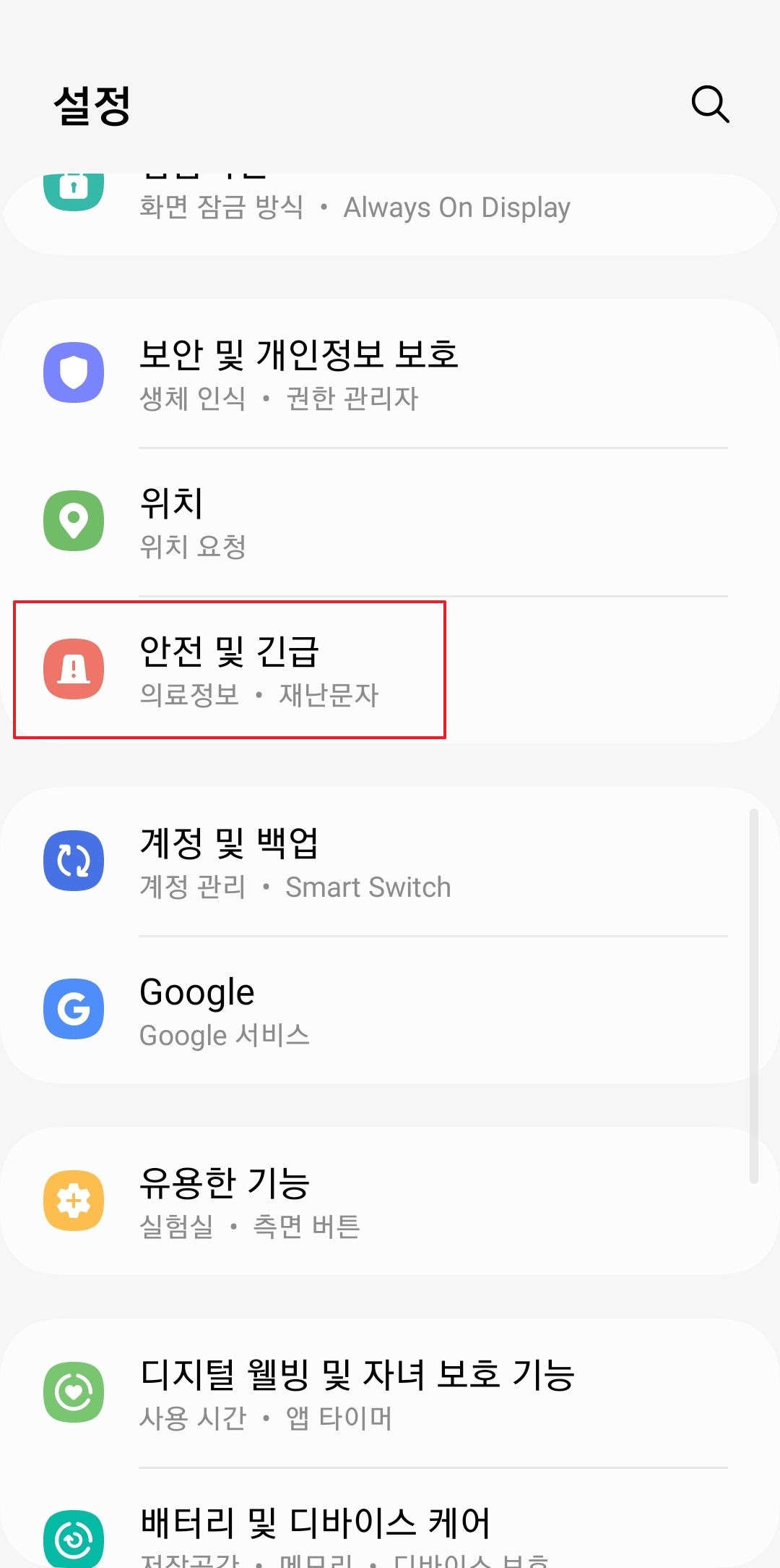 설정 메뉴로 들어오셨다면, 화면을 천천히 아래로 내려 '배터리' 항목과 '애플리케이션' 항목 사이에 있는 '안전 및 긴급' 메뉴를 찾아 터치해 주시면 됩니다. 이 메뉴는 위급 상황과 관련된 모든 기능들을 모아놓은 곳입니다.