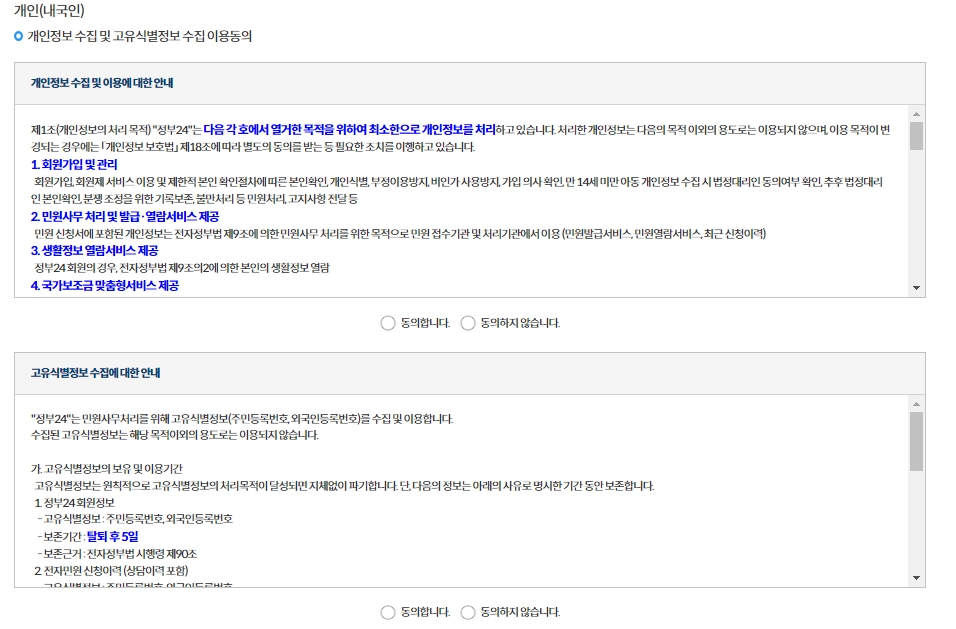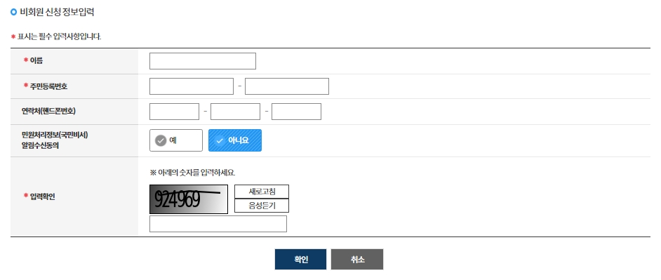 비회원 신청을 선택하면 개인정보 수집 동의와 고유식별정보 수집 동의 절차를 거치게 됩니다. 필수 항목에 모두 동의한 후, 이름과 주민등록번호, 그리고 자동입력 방지 문자를 정확히 입력하고 '확인'을 누르면 다음으로 진행됩니다.