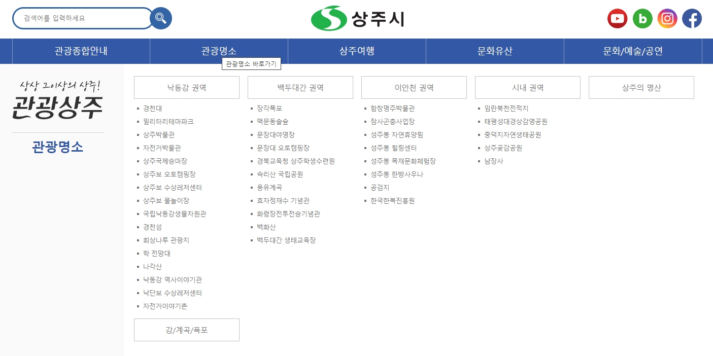 조금 더 자세한 정보를 원하신다면 '관광명소' 메뉴를 이용해 보세요. 이곳은 '상주 10선', '자연', '역사/유적', '체험/휴양' 등 여행객의 관심사에 따라 명소들이 잘 분류되어 있습니다.