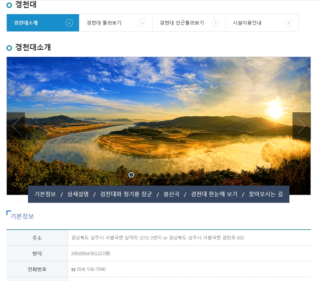 페이지에 접속하면 가장 먼저 눈에 띄는 곳이 바로 상주시가 가장 추천하는 대표 명소들입니다. 사진에서 보시는 것처럼 아름다운 풍경의 경천섬이나 아이들과 함께 가기 좋은 상주자전거박물관, 그리고 성주봉자연휴양림 등이 있습니다.