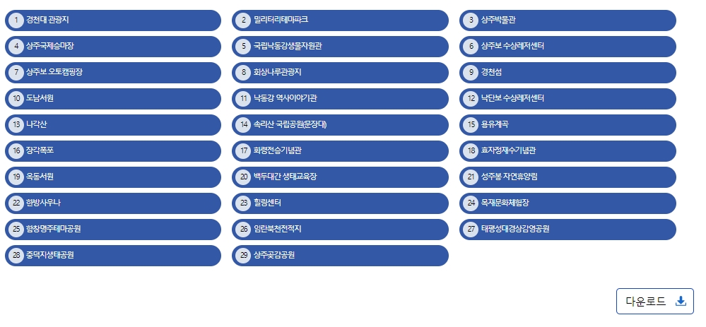 상주 관광지도에는 총 29개의 주요 명소가 표시되어 있습니다. 생각보다 넓은 지역에 명소들이 분포되어 있기 때문에, 모든 곳을 하루에 다 둘러보는 것은 사실상 어렵습니다.