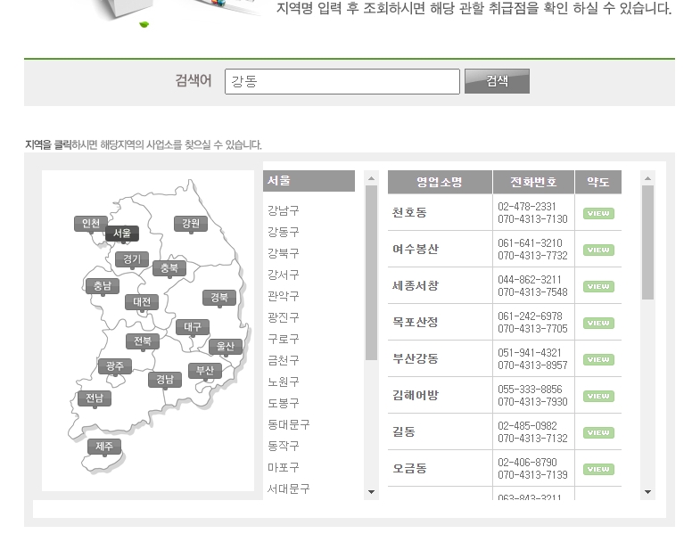 하지만 이 검색 기능은 정확한 명칭을 입력해야만 결과가 나오는 경향이 있어요. 예를 들어 '강동'이라고만 검색하면, '강동구' 전체가 아닌 '강동'이라는 이름이 포함된 특정 영업소만 나올 수 있습니다.