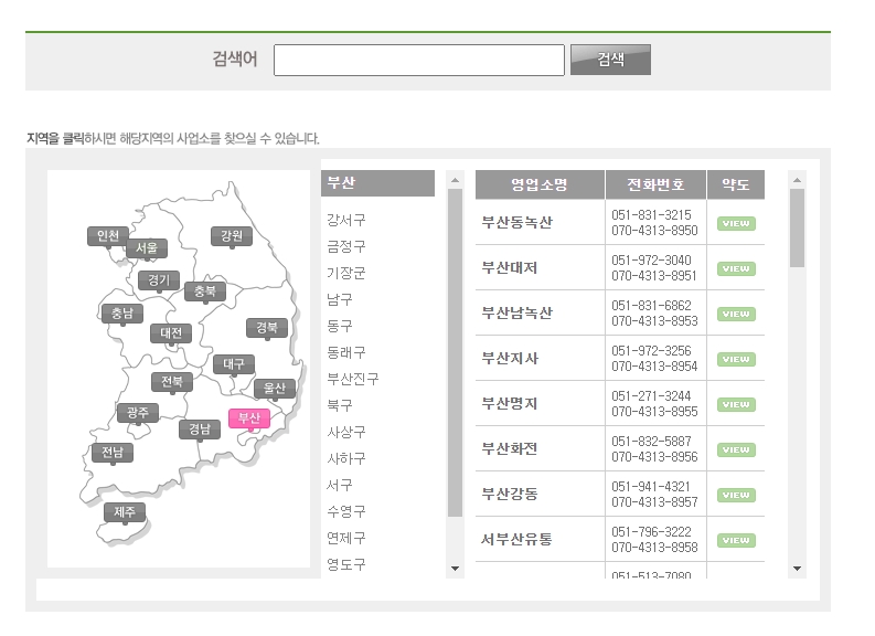 지도 옆 목록 상단에는 지점명을 직접 검색할 수 있는 검색창이 마련되어 있습니다. 내가 찾으려는 영업소의 정확한 이름을 안다면 이곳에 입력하고 '검색' 버튼을 누르면 됩니다.