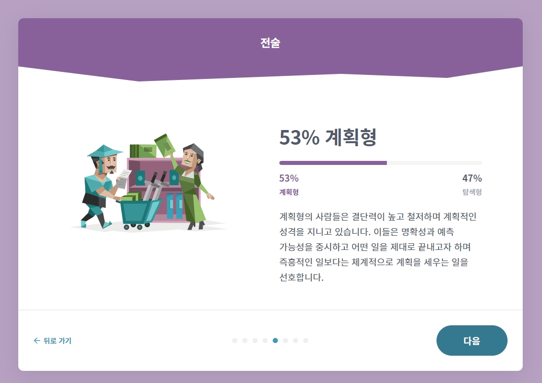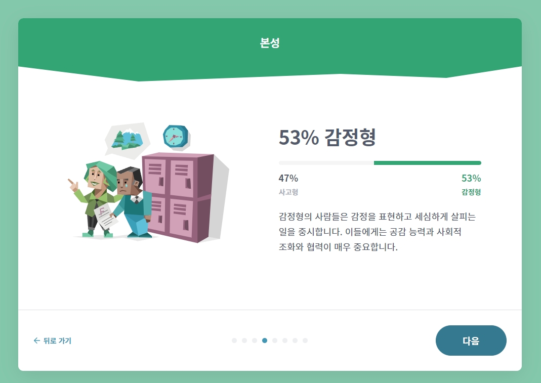 결과 화면에서는 해당 유형의 별명과 간단한 특징을 요약해서 보여줍니다. 여러분은 과연 어떤 유형이 나왔을지 궁금하네요. 하지만 여기서 끝이 아니랍니다. 더 자세한 분석 내용이 남아있어요.