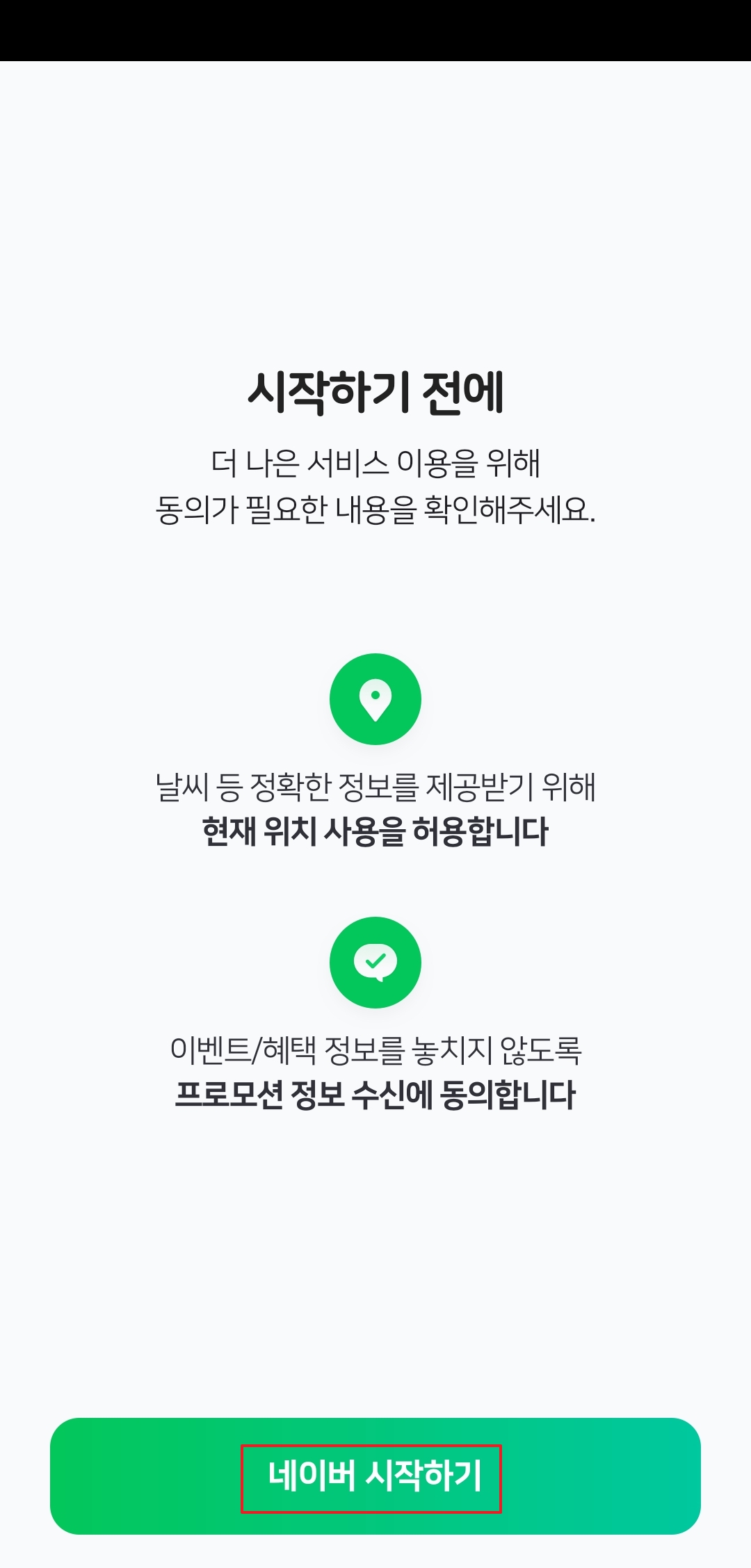 알림 설정을 넘어가면 '시작하기' 버튼이 보여요. 이걸 눌러서 다음 단계로 넘어가면 됩니다. 처음 설치할 때만 몇 가지 물어보는 게 있고, 다음부터는 바로 메인 화면이 뜰 거예요.