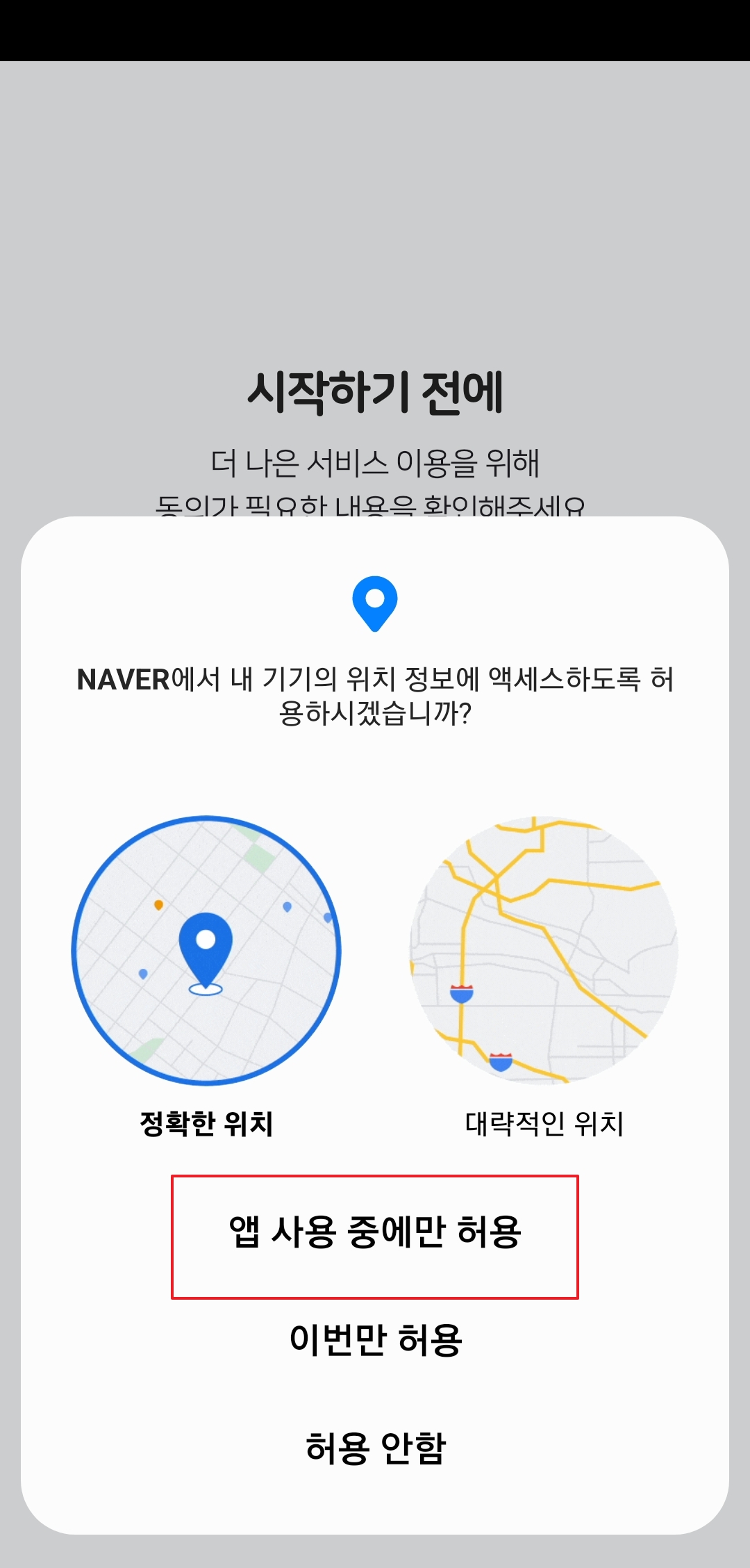 이제 위치 서비스 권한을 설정할 차례예요. 이건 '앱 사용 중에만 허용'을 누르시는 걸 추천해요. 그래야 현재 위치를 기반으로 날씨나 주변 정보를 정확하게 받을 수 있거든요. 물론 '거부'해도 꽃 검색은 가능합니다.