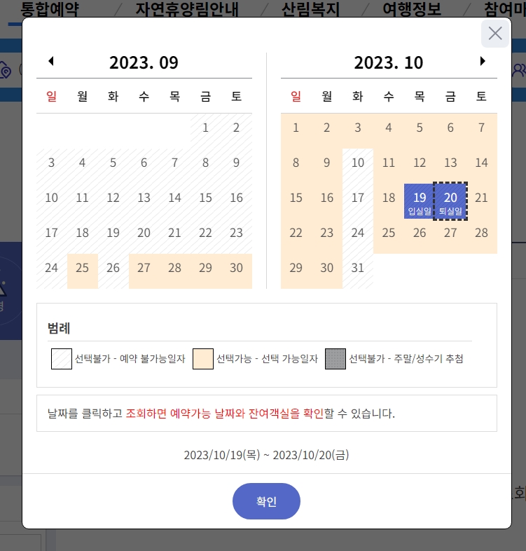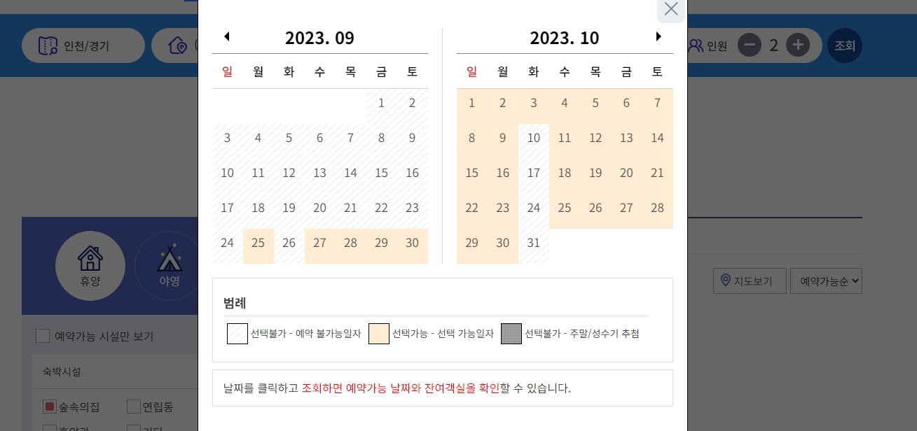 휴양림까지 정했다면 이제 '날짜 선택'을 누를 차례예요. 그럼 이렇게 달력이 팝업으로 뜨는데요. 색깔별로 의미가 다르니까 잘 보셔야 돼요.