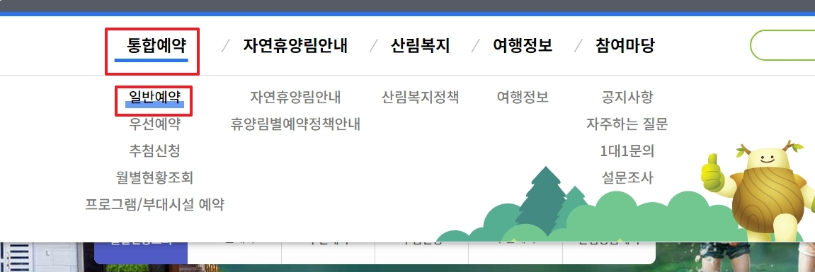 들어가시면 상단에 '통합예약', '추첨신청' 같은 메뉴들이 보일 거예요. 우리는 바로 예약할 거니까 '통합예약' 메뉴에 마우스를 올리거나 클릭해서 '일반예약'으로 들어가시면 됩니다. 이게 가장 기본이 되는 예약 방식이에요.