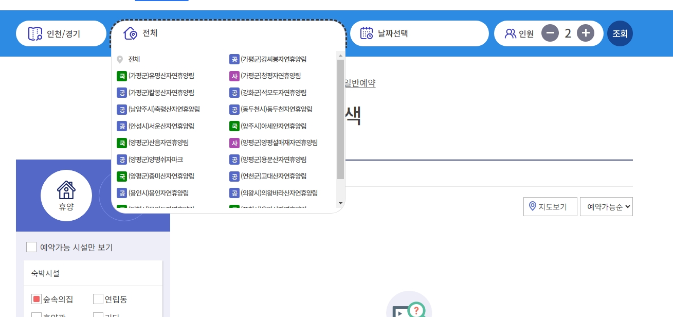 만약 꼭 가고 싶은 특정 휴양림이 있다면(예를 들어 '유명산 자연휴양림'처럼요), 목록에서 바로 그걸 선택하시는 게 편해요.