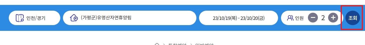 기준인원을 초과하면 추가 요금이 붙고, 최대인원을 넘어가면 아예 입실 자체가 안 될 수 있어요. 나중에 곤란한 일 겪지 않으시려면 방문할 인원수를 정확하게 입력하고 '조회' 버튼을 누르시는 게 좋아요.