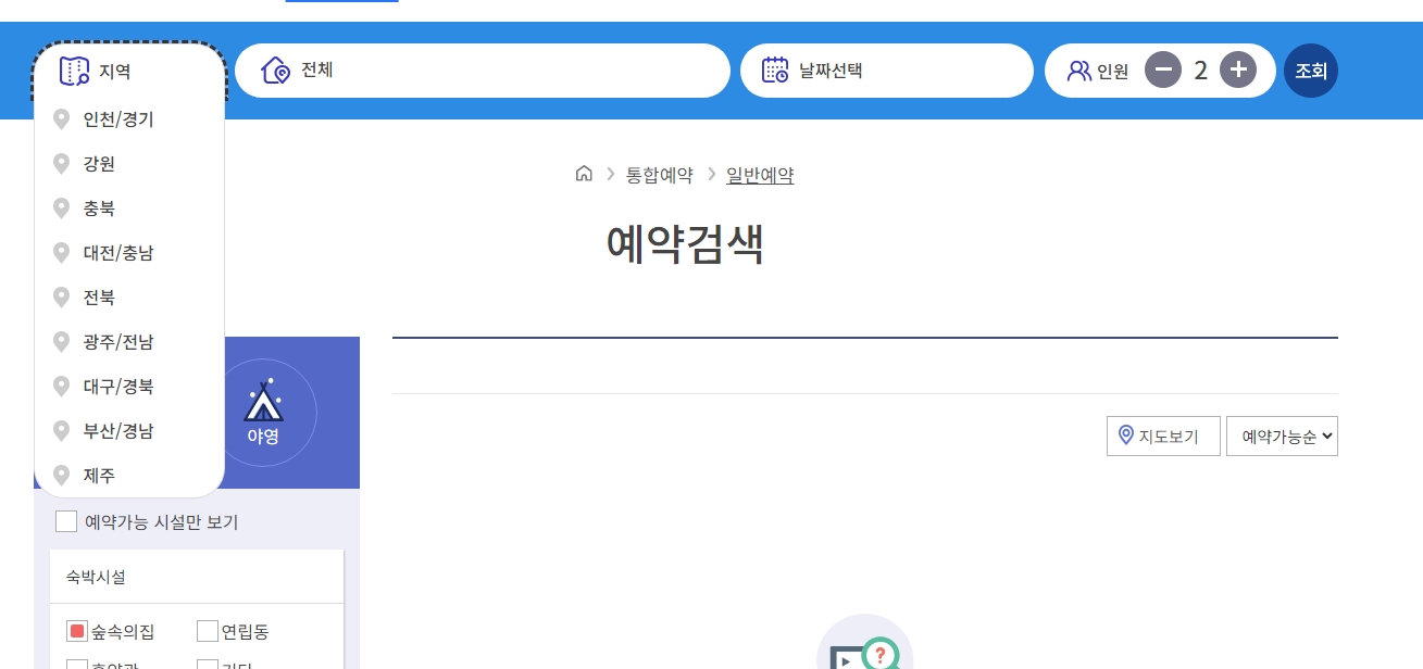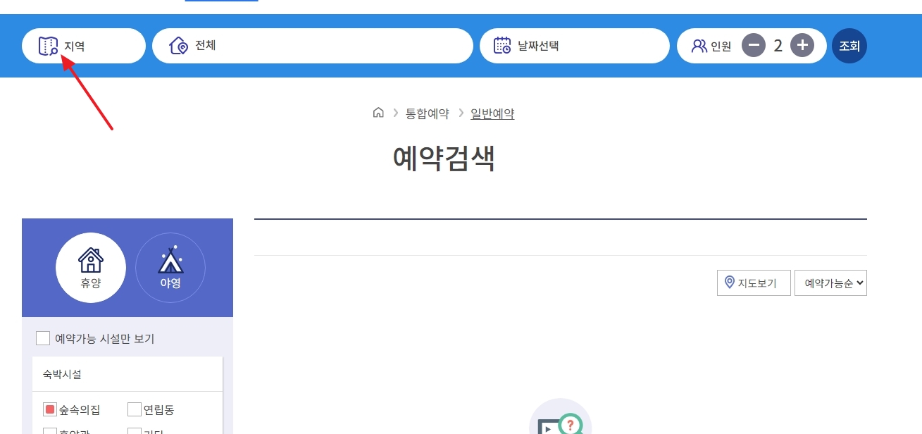 이걸 먼저 정하지 않으면 전국 모든 휴양림이 다 떠서 너무 복잡하더라고요. 내가 갈 지역부터 정하고 검색하는 게 훨씬 효율적이에요.
