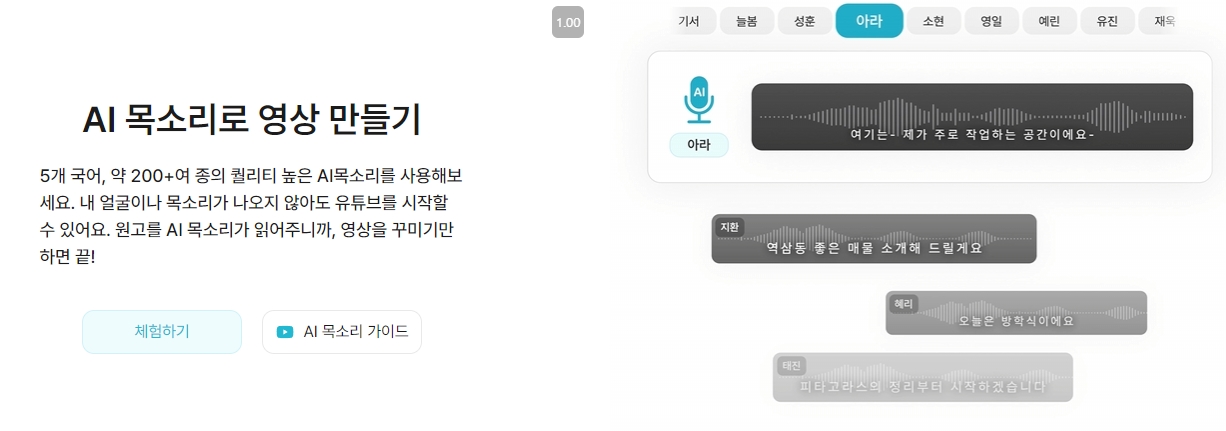 6. AI 목소리 기능을 통해 텍스트만 입력하면 200여 개의 다양한 AI 음성을 사용해 나레이션을 생성할 수 있습니다. 얼굴이나 실제 목소리를 녹음하지 않아도 영상 제작이 가능하며, 다국어 지원으로 외국어 영상도 쉽게 만들 수 있습니다.